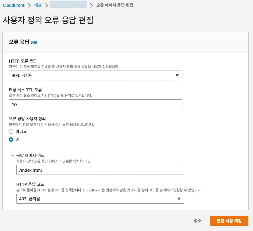 - CloudFront ์๋ฌ ํ์ด์ง ์ค์ ์ ์ํด